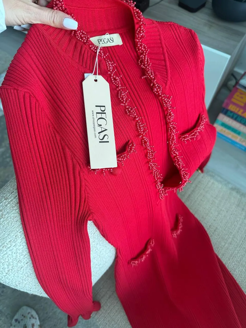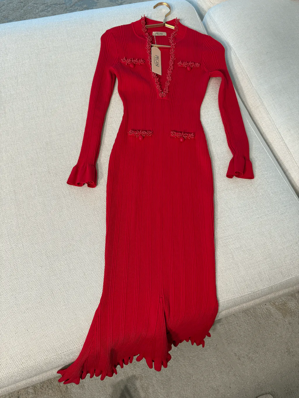 Command attention with the Alessia Ribbed Knit Midi Dress in a striking scarlet hue. Crafted from a premium ribbed stretch knit, this figure-hugging silhouette flatters every curve while offering effortless comfort. Intricate fringe detailing along the neckline and pockets adds a touch of couture refinement, while flared cuffs and a softly pleated hem create graceful movement with every step. Perfect for elegant lunches, special occasions, or evenings out — a true statement of timeless confidence and femininity.